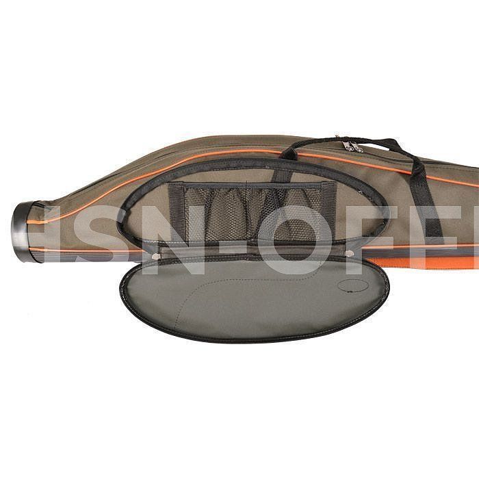 С наружной части чехла используется износостойкая и водоустойчивая ткань, которая легко очищается от грязи. Внутри и по бокам обклеена ППУ 2 мм. Стенки сбоку и перегородка покрыты тканью наполнителем ППЭ для защиты от трения и внешних повреждений. В производстве применяют итальянскую фурнитуру, почти не звенящую и не бликующую, а раскрой изделия выполняется на специальном для этого оборудовании, что обеспечивает отличное качество. Для более удобного переноса в конструкции тубуса предусмотрен ремень на плечо и ручка. Есть карманы, а также карманы-секции для использования стойки или подставки. В тубусе помещается от двух до пяти спиннингов. мягкие чехлы для катушек( 2 шт.) идут в комплекте.